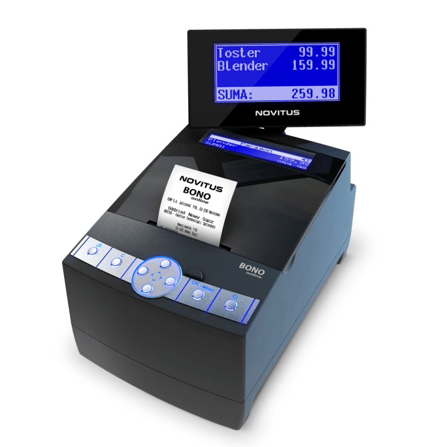 Drukarka fiskalna BONO Online to nowoczesna technologia, zamknięta w poręcznej i ergonomicznej obudowie z przeznaczeniem dla małych i średnich punktów handlowych, gdzie sprzedaż prowadzona jest z programu komputerowego, a drukarka będzie fiskalnym uzupełnieniem tego stanowiska. BONO Online należy do segmentu najbardziej zaawansowanych urządzeń fiskalnych. Zdalne zarządzanie, wbudowany serwer WWW, multi-komunikacja i najwyższe standardy bezpieczeństwa danych oraz wydajny i trwały mechanizm drukujący!